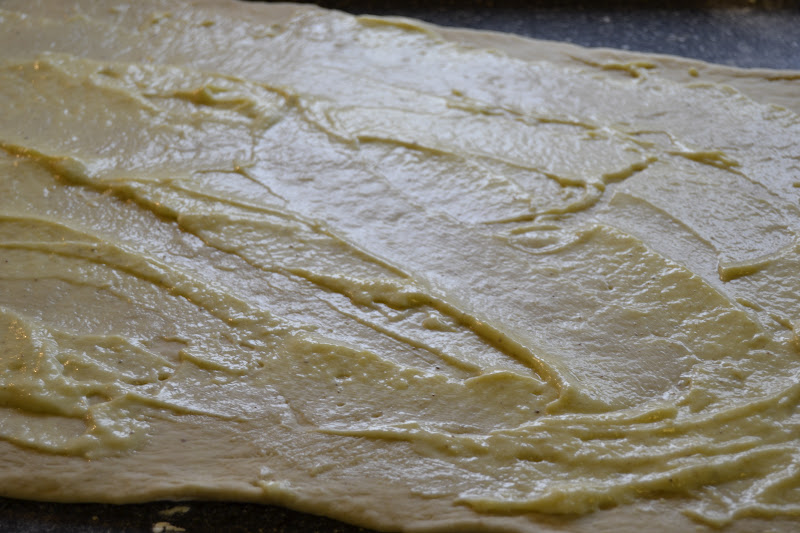 Kjevle ut resten av deigen.Smør utover fyllet .